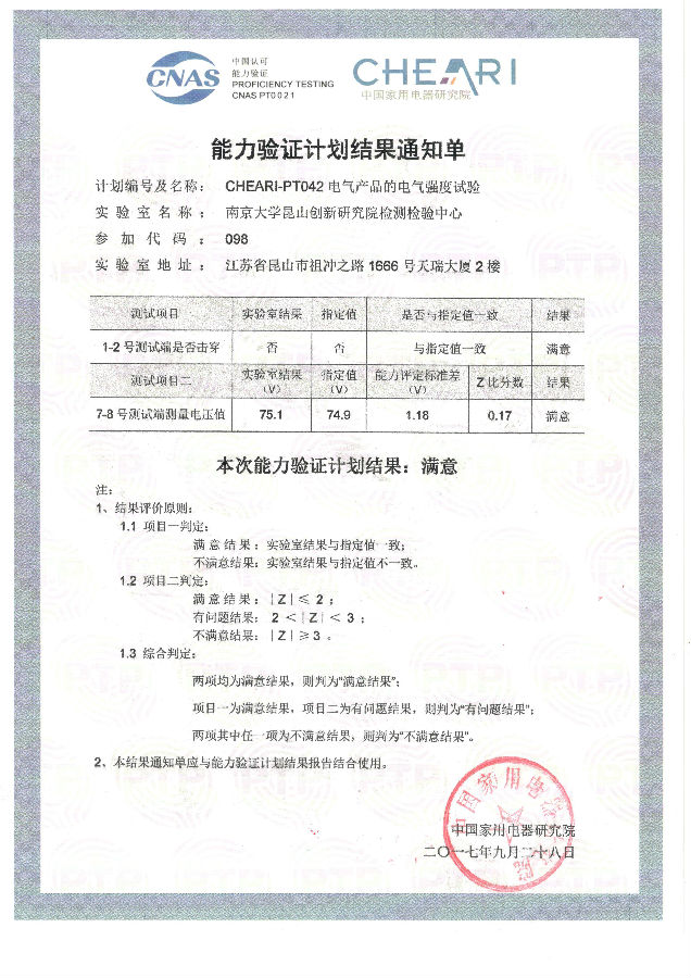 中心参加了CHEARI-PT042电气产品电气强度试验能力验证计划,本次能力验证计划共129家机构参加。9月28日得到中国家用电器研究院的正式函件,结果表明南京大学昆山创新研究院检测检验中心提交的全部测试项目检测结果且均为满意。