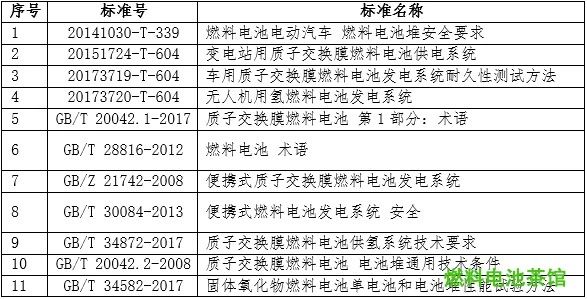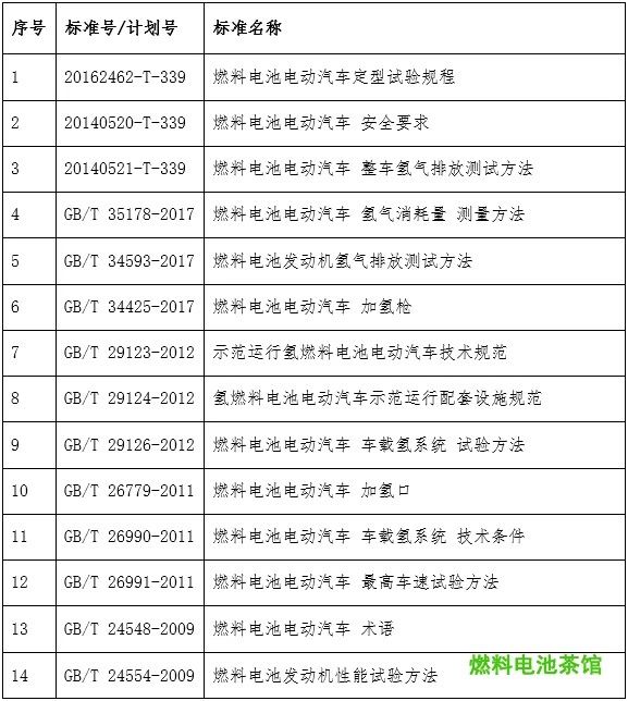 截止到2017年12月31日,已发布燃料电池汽车方面的标准共计14项,具体为: