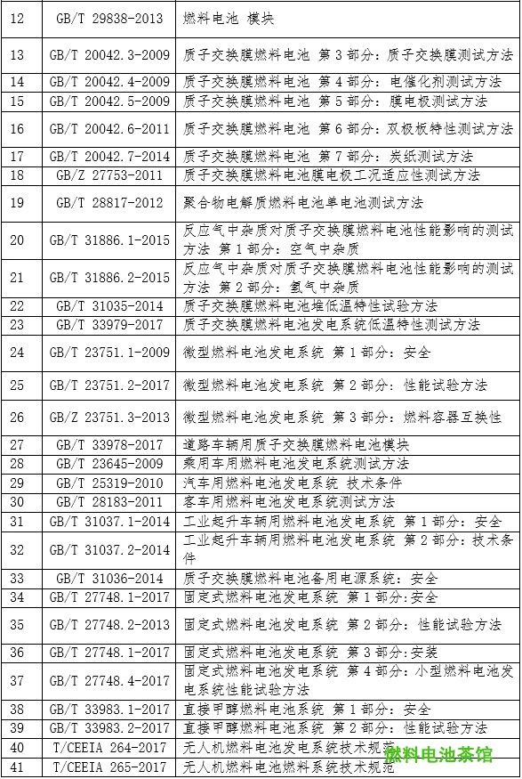 现有燃料电池领域国家标准36项,国家标准指导性技术文件3项,团体标准2项,详见下表: