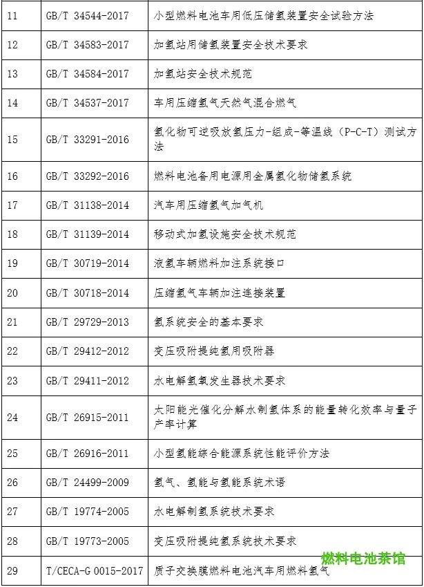 截止到2017年12月31日,由氢能标委会归口的国家标准共计27项,国家标准指导性技术文件1项,并发布了1项团体标准。详见下表: