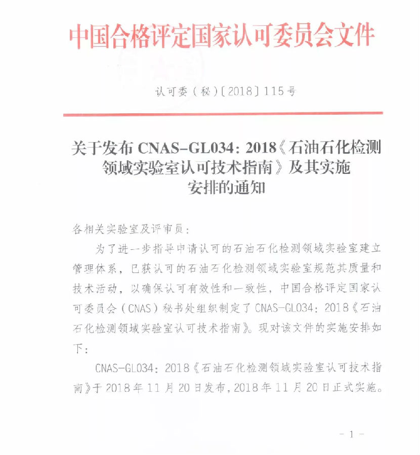 关于发布CNAS-GL034:2018《石油石化检测领域实验室认可技术指南》及其实施安排的通知