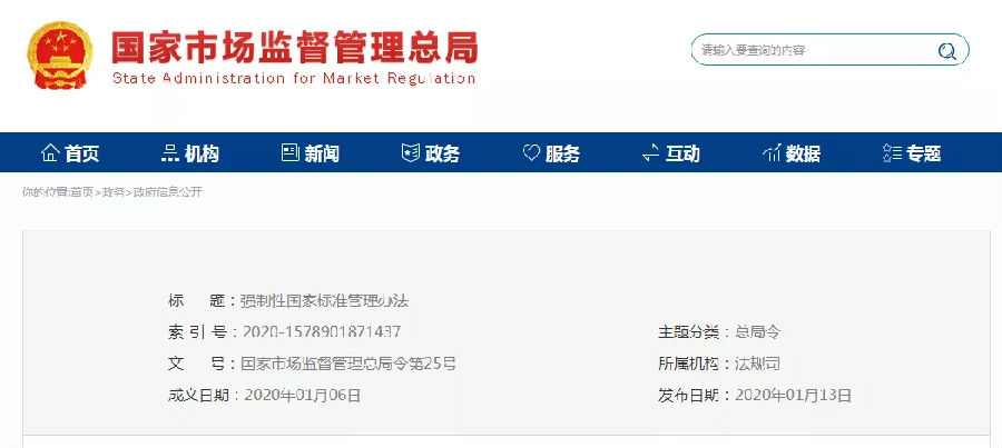 (2020年1月6日国家市场监督管理总局令第25号公布) 第一条 为了加强强制性国家标准管理,规范强制性国家标准的制定、实施和监督,根据《中华人民共和国标准化法》,制定本办法。 第二条 强制性国家标准的制定(包括项目提出、立项、组织起草、征求意见、技术审查、对外通报、编号、批准发布)、组织实施以及监督工作,适用本办法。 第三条 对保障人身健康和生命财产安全、国家安全、生态环境安全以及满足经济社会管理基本需要的技术要求,应当制定强制性国家标准。 第四条 制定强制性国家标准应当坚持通用性原则,优先制定适用于跨领域跨专业的产品、过程或者服务的标准。 第五条 制定强制性国家标准应当在科学技术研究成果和社会实践经验的基础上,深入调查论证,保证标准的科学性、规范性、时效性。 第六条 制定强制性国家标准应当结合国情采用国际标准。 第七条 制定强制性国家标准应当公开、透明,按照便捷有效的原则采取多种方式,广泛听取各方意见。 第八条 强制性国家标准应当有明确的标准实施监督管理部门,并能够依据法律、行政法规、部门规章的规定对违反强制性国家标准的行为予以处理。 第九条 国务院标准化行政主管部门统一管理全国标准化工作,负责强制性国家标准的立项、编号和对外通报。国务院有关行政主管部门依据职责负责强制性国家标准的项目提出、组织起草、征求意见和技术审查。强制性国家标准由国务院批准发布或者授权批准发布。 县级以上人民政府标准化行政主管部门和有关行政主管部门依据法定职责,对强制性国家标准的实施进行监督检查。 第十条 省、自治区、直辖市人民政府标准化行政主管部门可以向国务院标准化行政主管部门提出强制性国家标准的立项建议,由国务院标准化行政主管部门会同国务院有关行政主管部门研究决定。确有必要制定强制性国家标准的,国务院标准化行政主管部门应当明确项目提出部门,无需立项的应当说明理由。 社会团体、企业事业组织以及公民可以向国务院标准化行政主管部门提出强制性国家标准的立项建议,国务院标准化行政主管部门认为需要立项的,会同国务院有关行政主管部门研究决定。确有必要制定强制性国家标准的,国务院标准化行政主管部门应当明确项目提出部门,无需立项的应当说明理由。 第十一条 国务院有关行政主管部门依据职责向国务院标准化行政主管部门提出强制性国家标准项目。 涉及两个以上国务院有关行政主管部门的强制性国家标准项目,可以由牵头部门会同有关部门联合提出。 第十二条 国务院有关行政主管部门提出强制性国家标准项目前,应当充分征求国务院其他有关行政主管部门的意见,调查企业事业组织、社会团体、消费者和教育、科研机构等方面的实际需求,对项目的必要性和可行性进行论证评估。 第十三条 国务院有关行政主管部门提出强制性国家标准项目时,应当报送项目申报书和标准立项草案。项目申报书应当包括下列内容: (三)国内相关强制性标准和配套推荐性标准制定情况; (四)国际标准化组织、其他国家或者地区相关法律法规和标准制定情况; (五)强制性国家标准的实施监督管理部门以及对违反强制性国家标准行为进行处理的有关法律、行政法规、部门规章依据; (六)强制性国家标准所涉及的产品、过程或者服务目录; 第十四条 国务院标准化行政主管部门应当按照下列要求对强制性国家标准项目进行审查: (二)是否符合有关法律、行政法规的规定,是否与有关强制性标准的技术要求协调衔接; 第十五条 国务院标准化行政主管部门应当将符合本办法第十四条规定的强制性国家标准项目在全国标准信息公共服务平台向社会公开征求意见。 征求意见期限不得少于三十日。紧急情况下可以缩短征求意见期限,但一般不得少于七日。 第十六条 对于公众提出的意见,国务院标准化行政主管部门根据需要可以组织专家论证、召开会议进行协调或者反馈项目提出部门予以研究处理。 第十七条 国务院标准化行政主管部门应当根据审查意见以及协调情况,决定是否立项。 决定予以立项的,国务院标准化行政主管部门应当下达项目计划,明确组织起草部门和报送批准发布时限。涉及两个以上国务院有关行政主管部门的,还应当明确牵头组织起草部门。 决定不予立项的,国务院标准化行政主管部门应当以书面形式告知项目提出部门不予立项的理由。 第十八条 组织起草部门可以委托相关标准化技术委员会承担起草工作。 未组成标准化技术委员会的,组织起草部门应当成立起草专家组承担强制性国家标准起草工作。涉及两个以上国务院有关行政主管部门的强制性国家标准项目,牵头组织起草部门应当会同其他组织起草部门成立起草专家组。起草专家组应当具有权威性和代表性。 第十九条 强制性国家标准的技术要求应当全部强制,并且可验证、可操作。 强制性国家标准编写应当遵守国家有关规定,并在前言中载明组织起草部门信息,但不得涉及具体的起草单位和起草人信息。 第二十条 强制性国家标准应当对相关事项进行调查分析、实验、论证。 有关技术要求需要进行试验验证的,应当委托具有相应能力的技术单位开展。 第二十一条 起草强制性国家标准应当同时编写编制说明。编制说明应当包